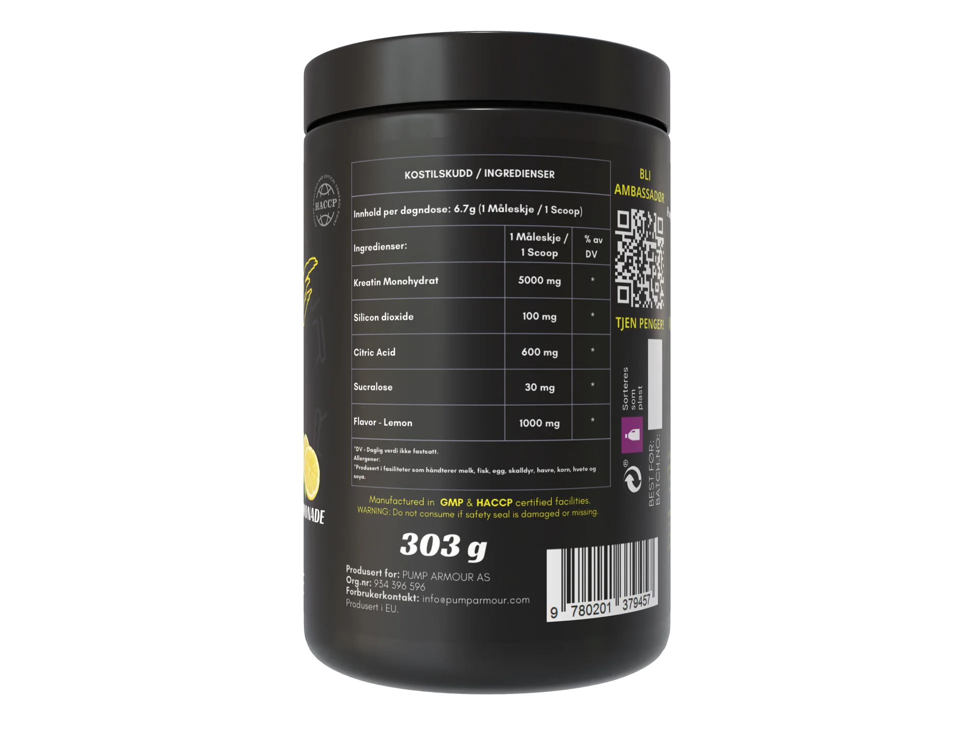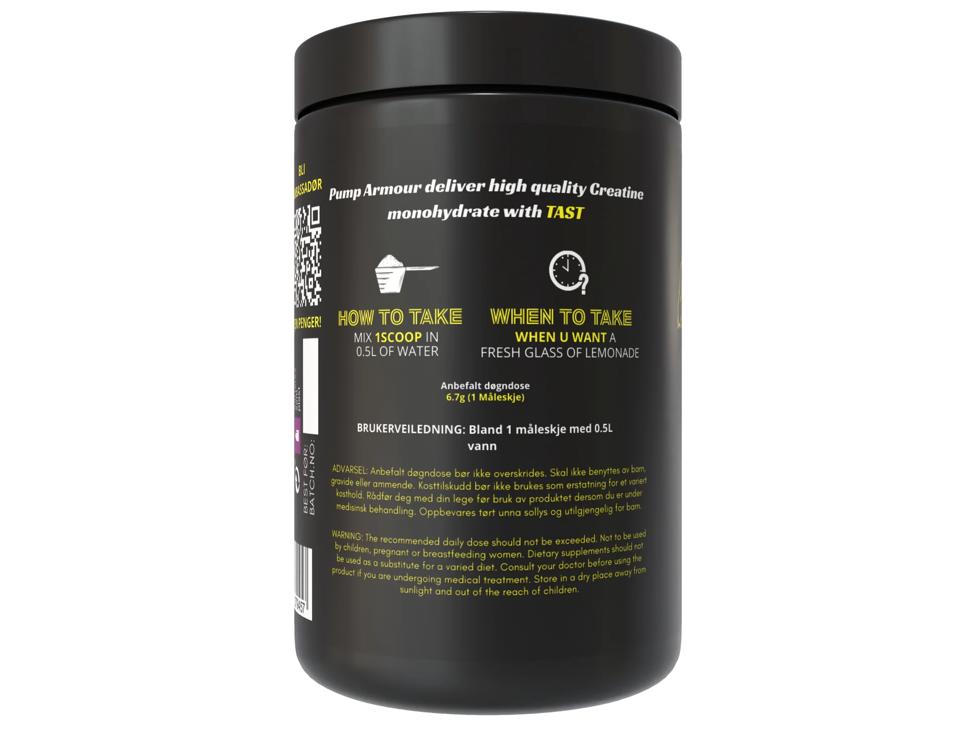 Pump Armour leverer høykvalitets monohydrat som blander seg lett ut i vann og har en forfriskende god smak av lemonade.